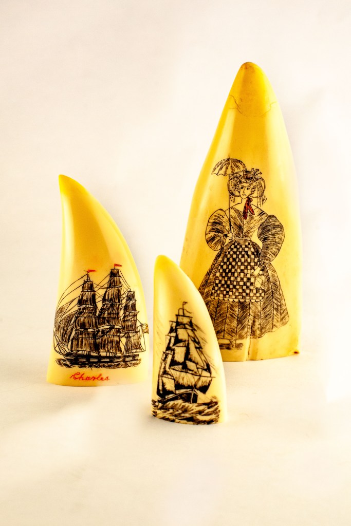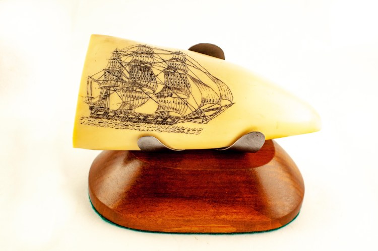 Le président Kennedy avait sur son bureau quelques dents scrimshaw (il s’agit d’os ou de dents de baleine sculptés avec des gravures) pour son amour de l’océan et des voiliers. Une des dents reposait sur un petit socle de bois.