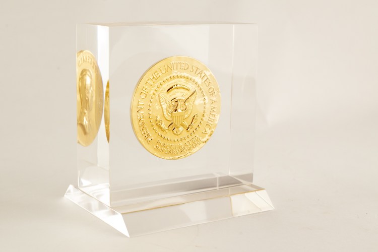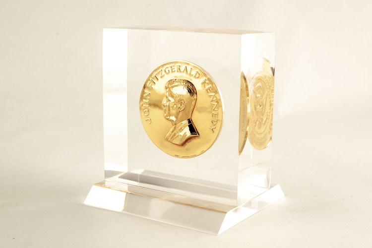 La médaille commémorant l’investiture du Président Kennedy lui a été présentée par le Comité de l’investiture.