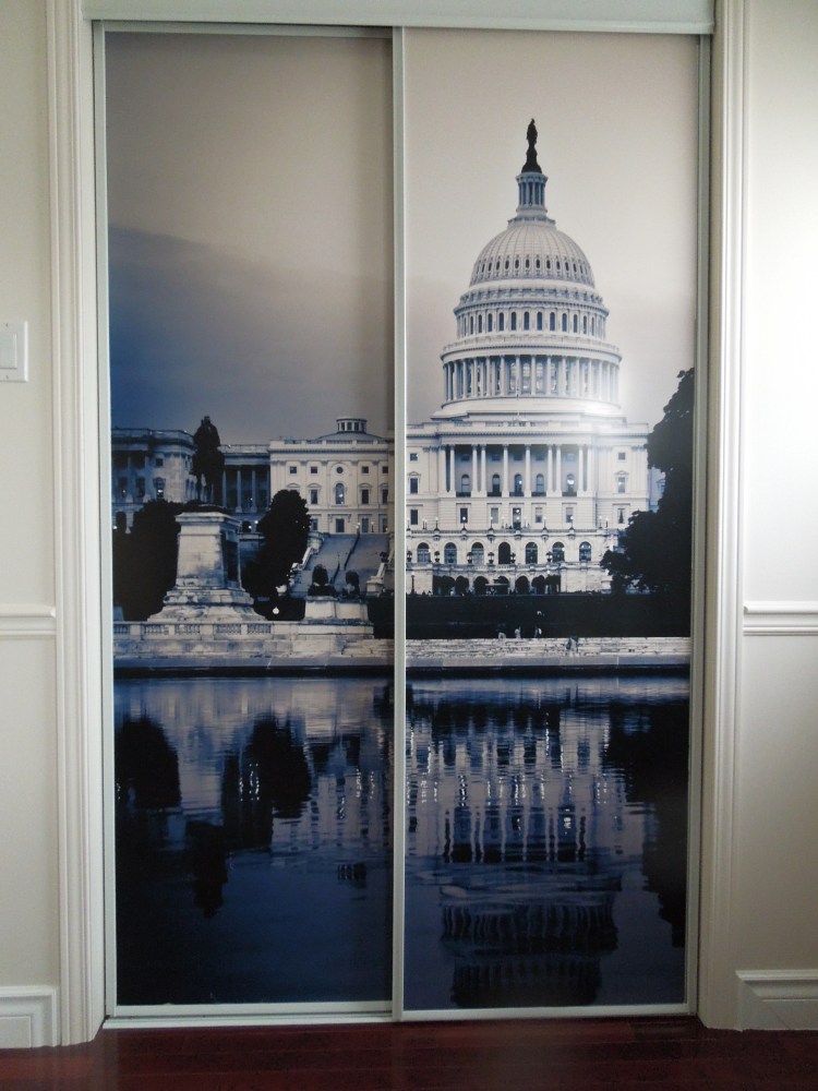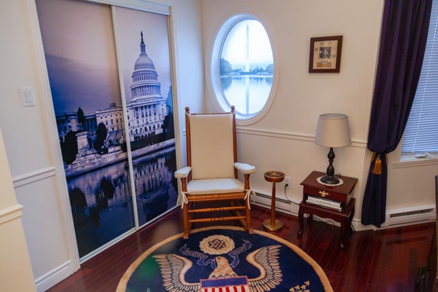 Dans mon petit Bureau ovale, il y avait des portes miroir pour la garde-robe. Pour cacher les miroirs, j’ai fait confectionner une photographie représentant l’édifice du Capitole.