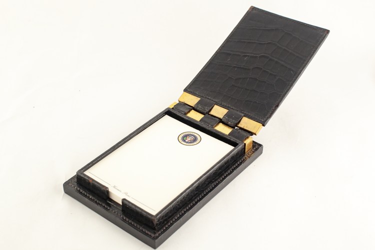 Le président Kennedy avait sur son bureau un cendrier Waterford en cristal avec les armoiries des Kennedy. Le cendrier a été présenté au Président Kennedy par Mme Dorothy Tubridy de Dublin en Irlande.
